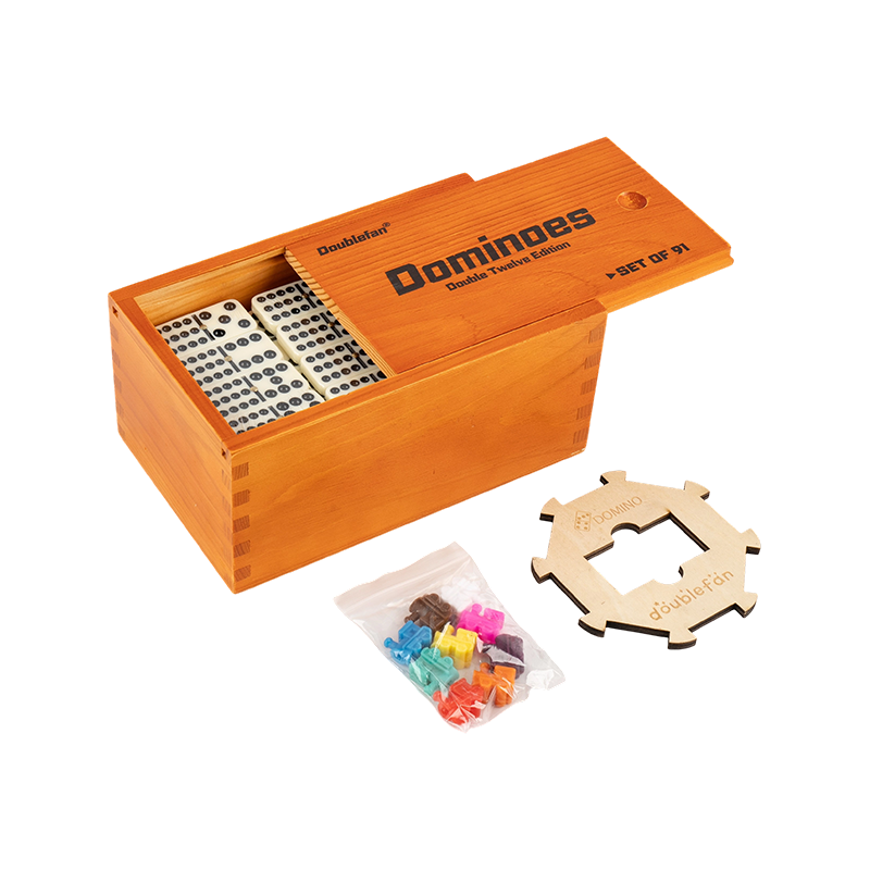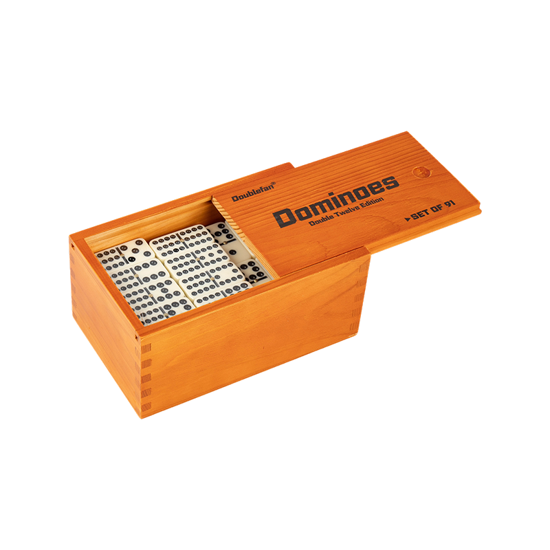 Doppelte 12 Dominosteine mit bunten Punkten in Holzkiste Doppelte 12 Dominosteine mit bunten Punkten in Holzkiste Doppelte 12 Dominosteine mit bunten Punkten in Holzkiste