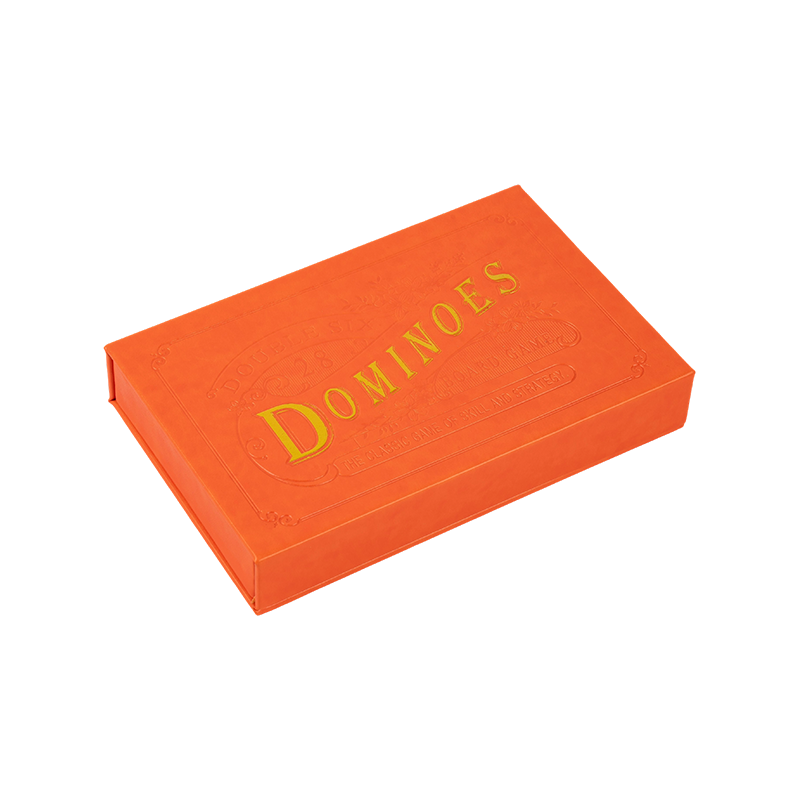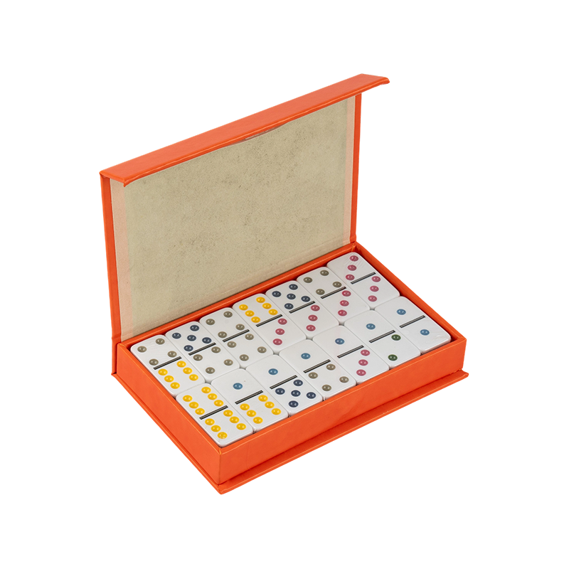 HOME / Produkte / Dominospiel-Set / Doppelte 6 Dominosteine / Double 6 Domino in Papierkasten / 28-teilige klassische doppelte sechs Dominosteine ​​in orange umweltfreundlicher Papierschachtel
